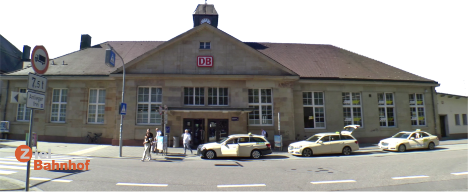 Ein neues Stationsgebäude aus Sandstein errichtet, wurde am 9. Dezember 1911 von den Bad. St. B. in Betrieb genommen. Es bestand aus einem traufenständigen, einstöckigen Hauptgebäude mit hohen Sprossenfenstern und Walmdach, das durch jeweils einen markanten Giebelrisalit an Orts- und Gleisseite aus der Fassade hervorsprang. Ein Uhrenturm auf dem Dach markierte das Gebäude. Durch die Schalterhalle gelangten die Reisenden zu dem Fahrkarten- und Gepäckschalter sowie Zugänge zu den Wartesälen und einem Bahnhofsrestaurant. Die Diensträume befanden sich beidseitig neben der Schalterhalle. Ein Personentunnel vom überdachten Hausbahnsteig, führte zu den teilüberdachten Inselbahnsteigen.Ein separates, zweistöckiges Wohnhaus mit Walmdach für die Bahnbediensteten befand sich im Norden, im Süden befand sich ein interessantes, einstöckiges Nebengebäude mit Walmdach.Der Bahnhof besaß eine Eilgüterabfertigung und gehörte 1938 zur RangklasseI.Weitere Streckeneröffnungen, Ausbauten oder Änderungen•1913 wurde das alte Bahnhofsgebäude geschlossen und später abgerissen.•1957 errichtete die Deutsche Bundesbahn (DB) einen Stellwerksanbau auf dem Hausbahnsteig.•2002 wurde das Stellwerk von 1957 aus dem Betrieb genommen und durch ein modernes ersetzt.•2003 bis 2005 erneuerte die Deutsche Bahn AG (DBAG) die Bahnsteige und baute einen „DB ServiceStore“ in der Schalterhalle.Was hat sich verändert, was ist gebliebenDas Empfangsgebäude und das Wohnhaus von 1911 sind weitgehend erhalten und in einem guten Zustand. Lediglich ein neuer Anbau im Süden beeinträchtigt das Gebäude.